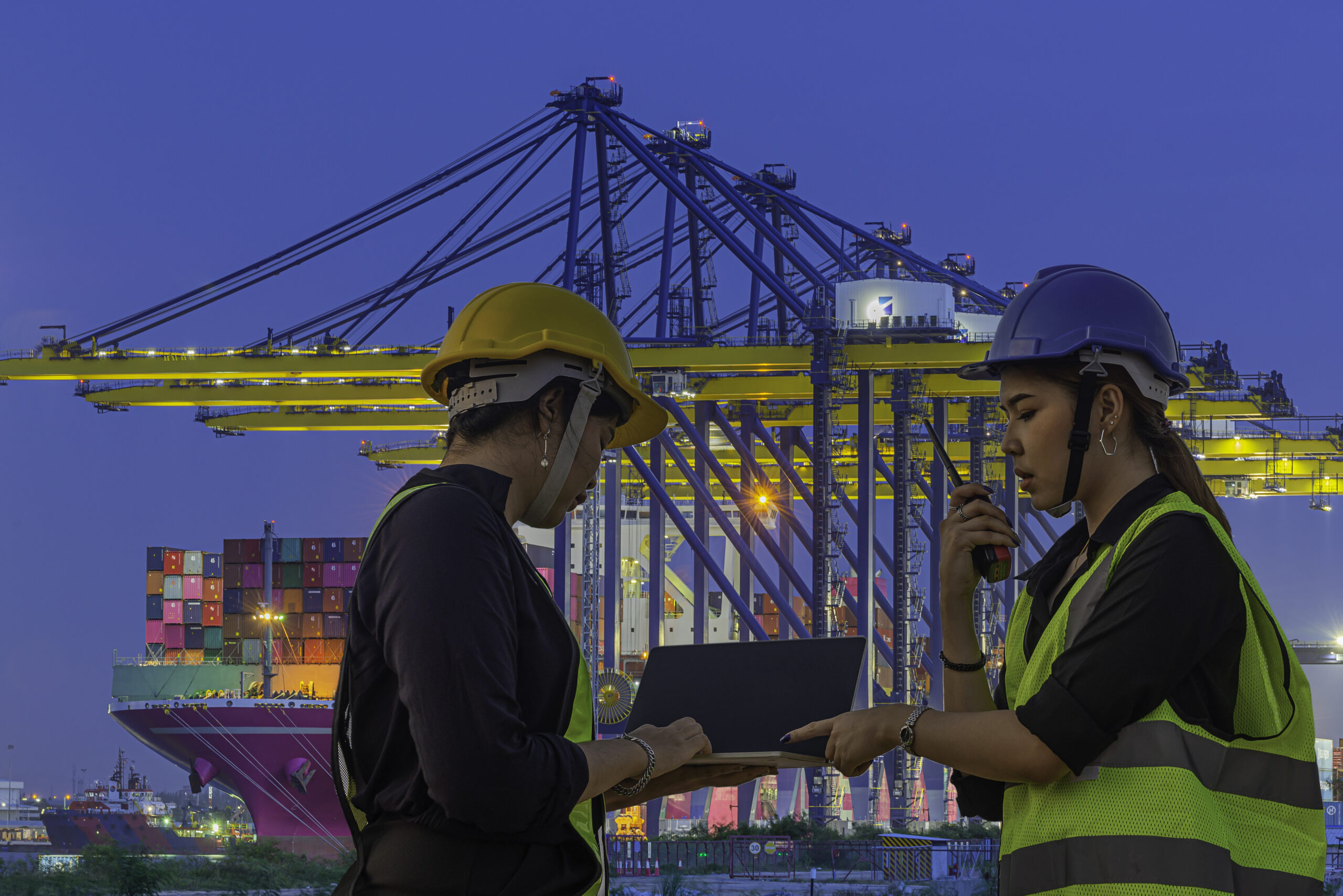 Engineers are looking at and inspecting containers. Container export business. Container exports sea and land products via radio communication and computers.